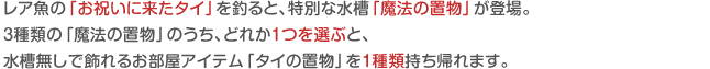 ※1月1日リリースのレア魚はお休みします。 ※レア魚は、釣れる確率が高くないため、イベント期間中に釣れない場合もあります。 ※普通の水槽も選ぶ事ができます。 ※レア魚1匹につき、1種類の水槽を選ぶ事ができます。 ※魔法の水槽で持ち帰る際は、水槽代として200コイン(無料コイン)がかかります。