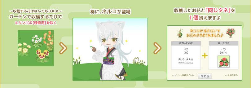 ※イベント期間中に貰えるタネは、有料・無料・レアカラー問わず、収穫したお花と「同じ種類のタネ」になります。