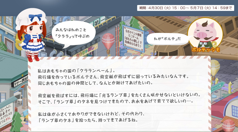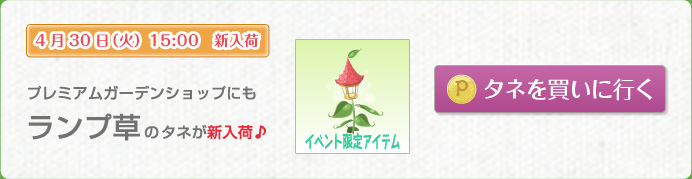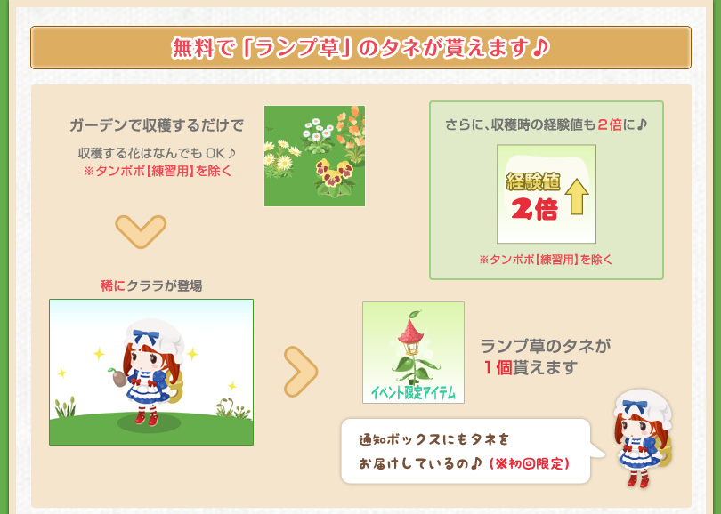 ※収穫時の「クララ」は稀に登場します。(必ず登場するわけではありません) ※収穫時に、稀に拾える「レアカラーのタネ」も、同時に拾える場合があります。 ※クララから「ランプ草」のタネを貰える期間は、4月30日(火)15:00から5月7日(火)14:59までとなります。