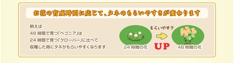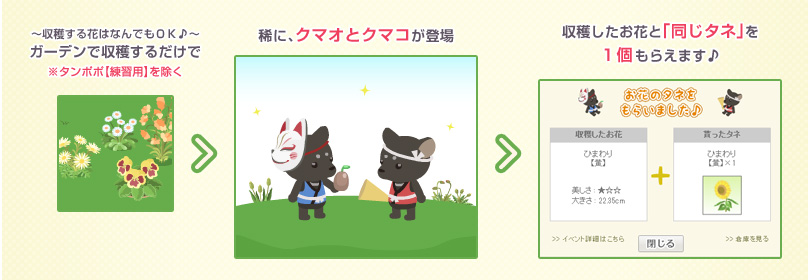 ※収穫時にタネがもらえる確率はランダムです。必ずもらえるわけではありません。 ※イベント期間中にもらえるタネは、有料、無料、レアカラーを問わず、収穫したお花と「同じ種類のタネ」になります。 (ただし、メガ花の収穫時にもらえたタネについては、必ずメガ化するわけではありません) ※収穫時に「レアカラーのタネ」も、同時に拾える場合があります。 ※イベント期間中にサーバーなどの障害が発生した場合、その障害の規模や、発生時期によって、期間を延長する場合もございます。