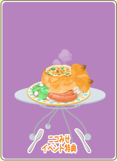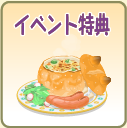 イベント期間内に、通常サイズの「ペロッと満腹具沢山パングラタン」を 2000個販売すると、対象料理のきせかえアイテムがもらえます。