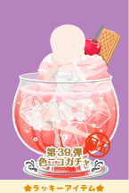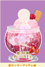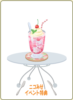 色ニコガチャ第39弾のアイテム(全11点)を着用して、イベント限定料理 「シュワッと弾けるチェリーサイダー」を作ると、完成数がアップ。 着用アイテム1点につき、作れる数が20%上昇します。(※最大100%)